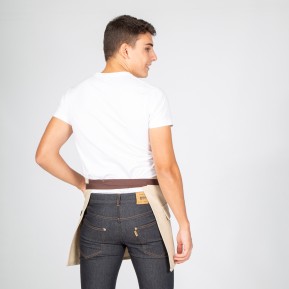 19,50 €Delantal sin peto con tres bolsillos delanteros. Cierre mediante tiras laterales para anudar. Modelo en color beige. Tiras de espiga en color chocolate. Ideal para uniforme de bares, restaurantes, cafeterías, chefs o comercios. -