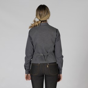 36,54 €Chaleco para mujer, con botones de presión metálicos y dos bolsillos de parche. Modelo ajustado, con costadillos delanteros, pinzas traseras y cintas con hebilla en la espalda. Confeccionado en VAQUERO ELÁSTICO, combinado en bolsillos y hombros con antelina marrón. Ideal para uniformes de camareras en hostelería y restauración o comercio. Disponible también modelo para hombre referencia 994800. -