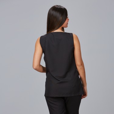 Sin mangas y con un refinado cuello tipo smoking, esta blusa presenta un bolsillo de vivo en el delantero derecho y detalles estampados que añaden singularidad y estilo al uniforme. Las pinzas estratégicamente ubicadas en la espalda, pecho y delantero ofrecen un ajuste personalizado, realzando la figura con una cinta a modo de lazo en la cintura.