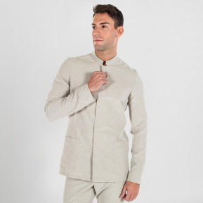Su diseño semi ajustado se adapta a la silueta sin renunciar a la comodidad. Destaca por su cierre cruzado (derecho sobre izquierdo al vestir), con el primer botón visible y el resto ocultos, lo que aporta un acabado limpio y elegante. Además, incorpora canalé en costados y mangas, mejorando la elasticidad y el ajuste.