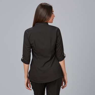 Destacando detalles como la media manga con trabilla de adorno y botón fijo, la BLUSA MUJER CUELLO MAO VINCA se distingue en tu atuendo laboral, marcando la diferencia en la industria de la belleza.