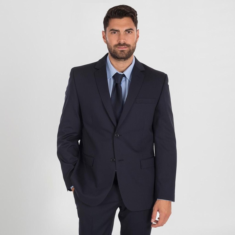 Americana de hombre ajustada, con dos botones, pinzas en delantero y dos aberturas traseras. Cuenta con dos bolsillos de vivo y cartera laterales, un bolsillo de vivo en pecho y tres bolsillos interiores.