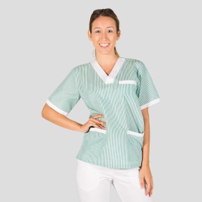 24,30 €Casaca para mujer cerrada, en manga corta, con cuello pico, un bolsillo en pecho izquierdo y dos bolsillos delanteros. Prenda holgada, con aberturas laterales. Confeccionada en Vichy de rayas celeste, verde o rosa, combinada en bocamangas, cuello y vivos de bolsillos en blanco. Modelo clásico, ideal para uniforme de limpieza. Disponible también modelo abierto referencia 652000. -