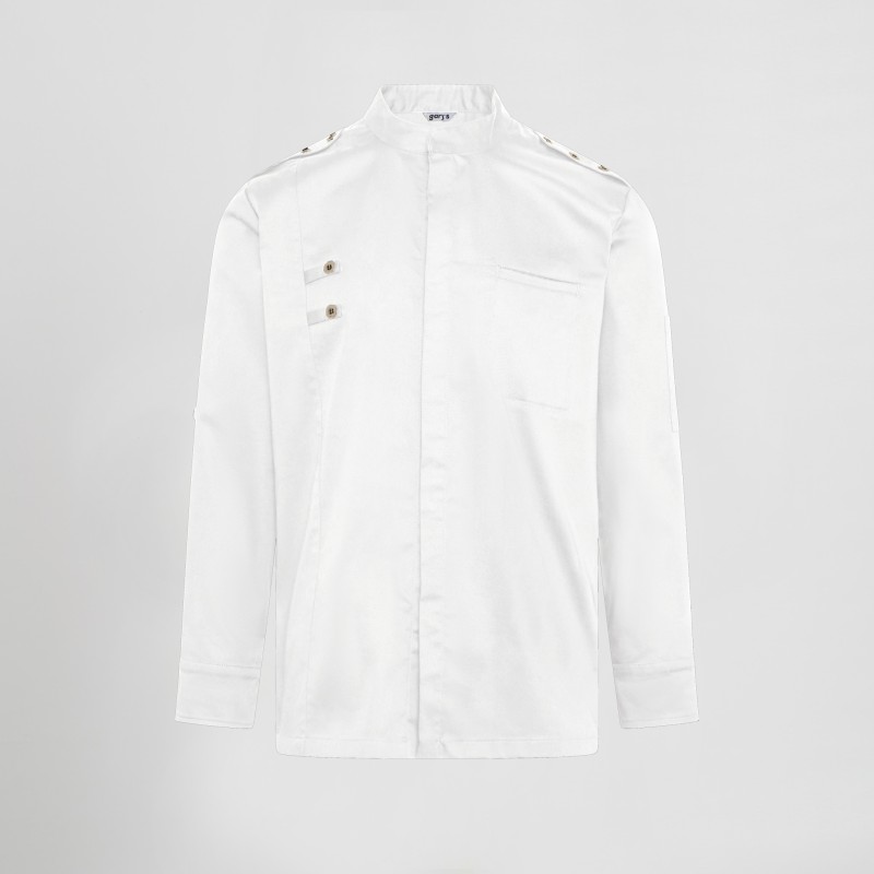 Este modelo presenta un corte semi ajustado (H2) que favorece la silueta masculina sin comprometer la movilidad. Su cuello mao y las charreteras en los hombros aportan un estilo distintivo y sofisticado, mientras que los costados con tecnología AIR DRY garantizan ventilación continua, manteniéndote fresco incluso en cocinas de alta temperatura.