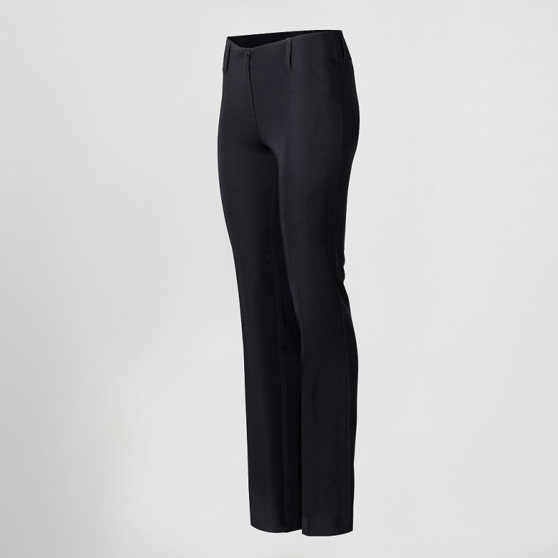 Pantalón de mujer ajustado, sin pinzas en delantero, de talle bajo. Dispone de trabillas en la cintura y cierre con botón y cremallera en delantero. Confeccionado en tejido BIELÁSTICO TECNO (215gr/m²) de 96% Poliéster - 4% Elastano, lo que le aporta un mejor ajuste que modela y realza las formas, con alta resistencia a las manchas y fácil planchado. Ideal como uniforme para camarera en bares, restaurantes y cafeterías, bandas de música, recepción, transportes, oficina o comercio.