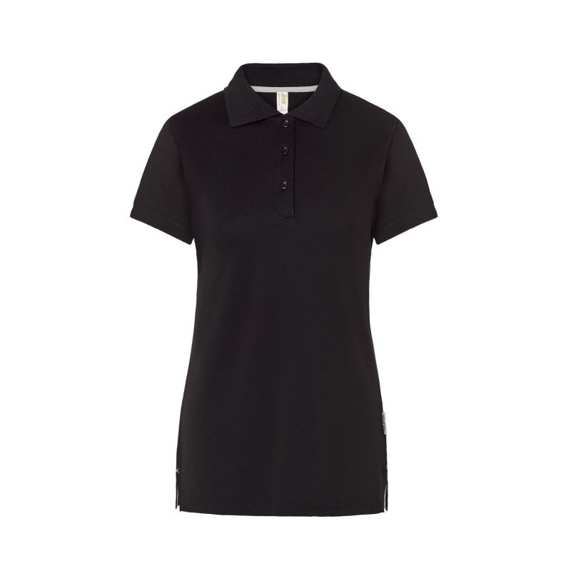 Polo piqué deportivo de manga corta para mujer, ligeramente entallado, con tapeta de tres botones, tapacosturas y aberturas laterales en contraste. Disponible en 7 colores y desde la talla S hasta la 3XL. Etiqueta removible.